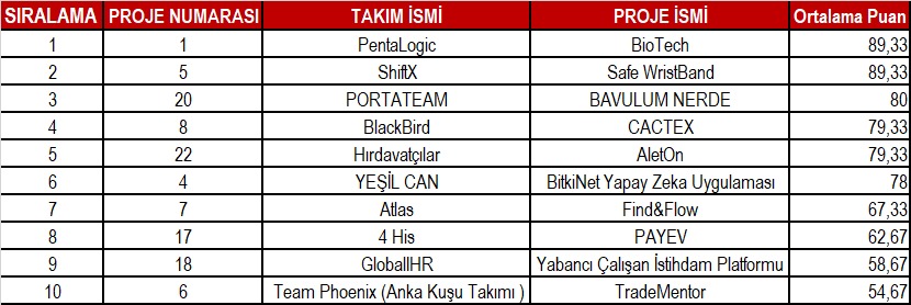 Yapılan değerlendirmeler sonucunda 10 takım yarı final aşamasını başarıyla geçmiştir. Ön değerlendirme sonuçlarına ilişkin takım ve proje bilgileri için TIKLAYINIZ.